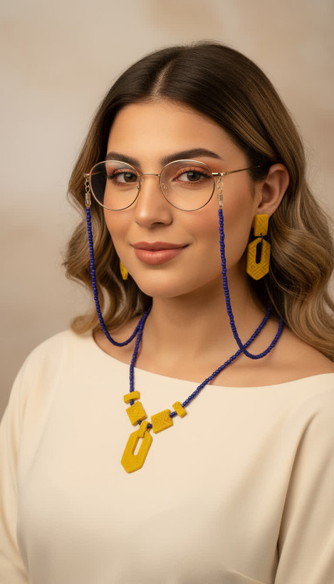 تلفیقی از هنر پلیمری و جواهرسازی، در قالب ستی که تنها یکبار خلق شده. جزئیاتش با خمیر پلیمری دستساز ساخته شده، و هر مهرهی آبی، با دقت و نظم ترکیب شده تا حس اصالت و تفاوت رو کنار هم بیاره. رنگها حرف میزنن — آبیِ عمیق و زردِ جسور، ترکیبی که نگاه رو میدزده و موندگار میمونه.
