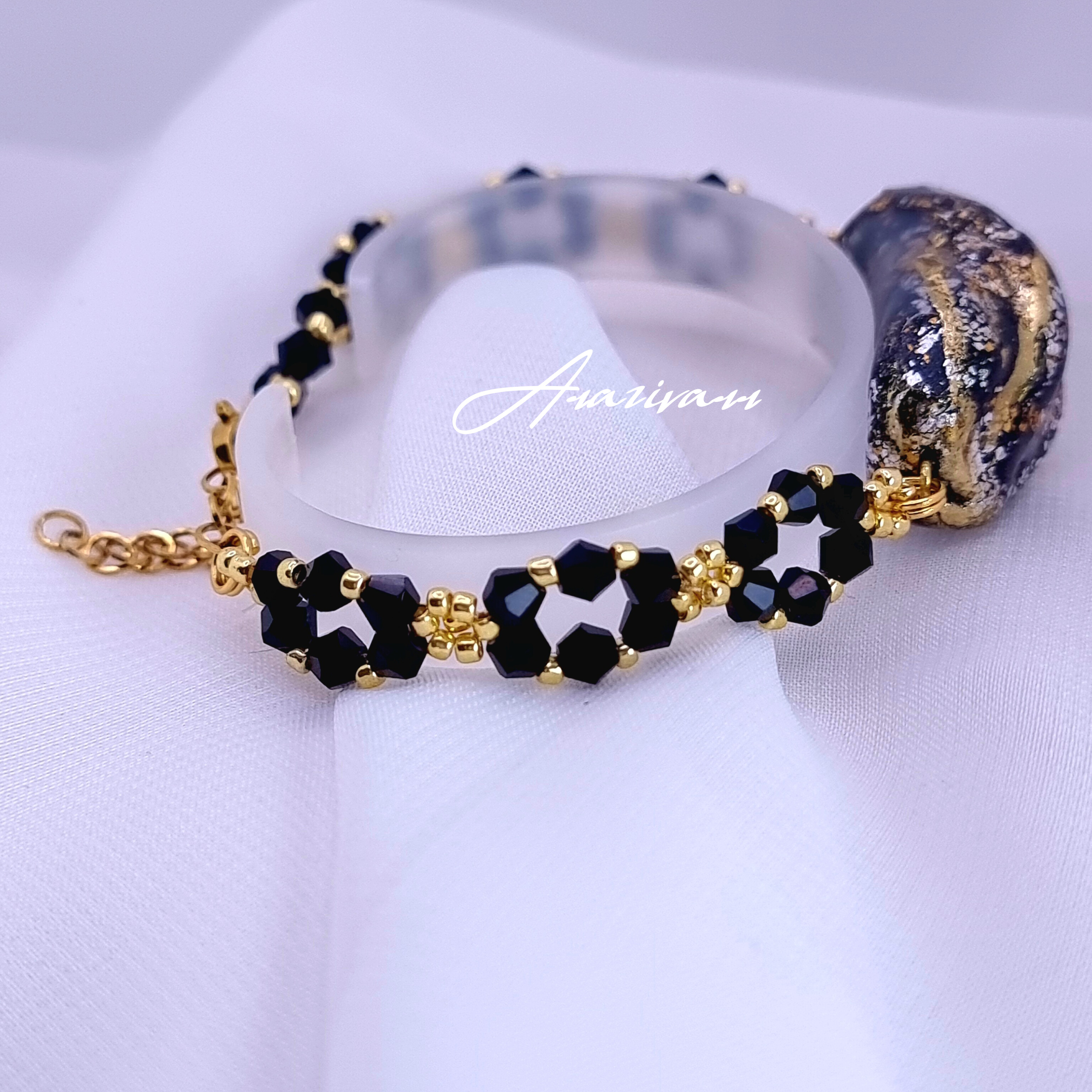 دستبند دفرمه و پینترستی مشکی طلایی ساخته شده با متریال استدلر و منجوق درجه یک ژاپنی میوکی و کریستال های درجه یک نشکن ، مقاوم در برابر آب و کاملا دستساز می باشداتصالات استیل ضد حساسیت و رنگ ثابت می باشد